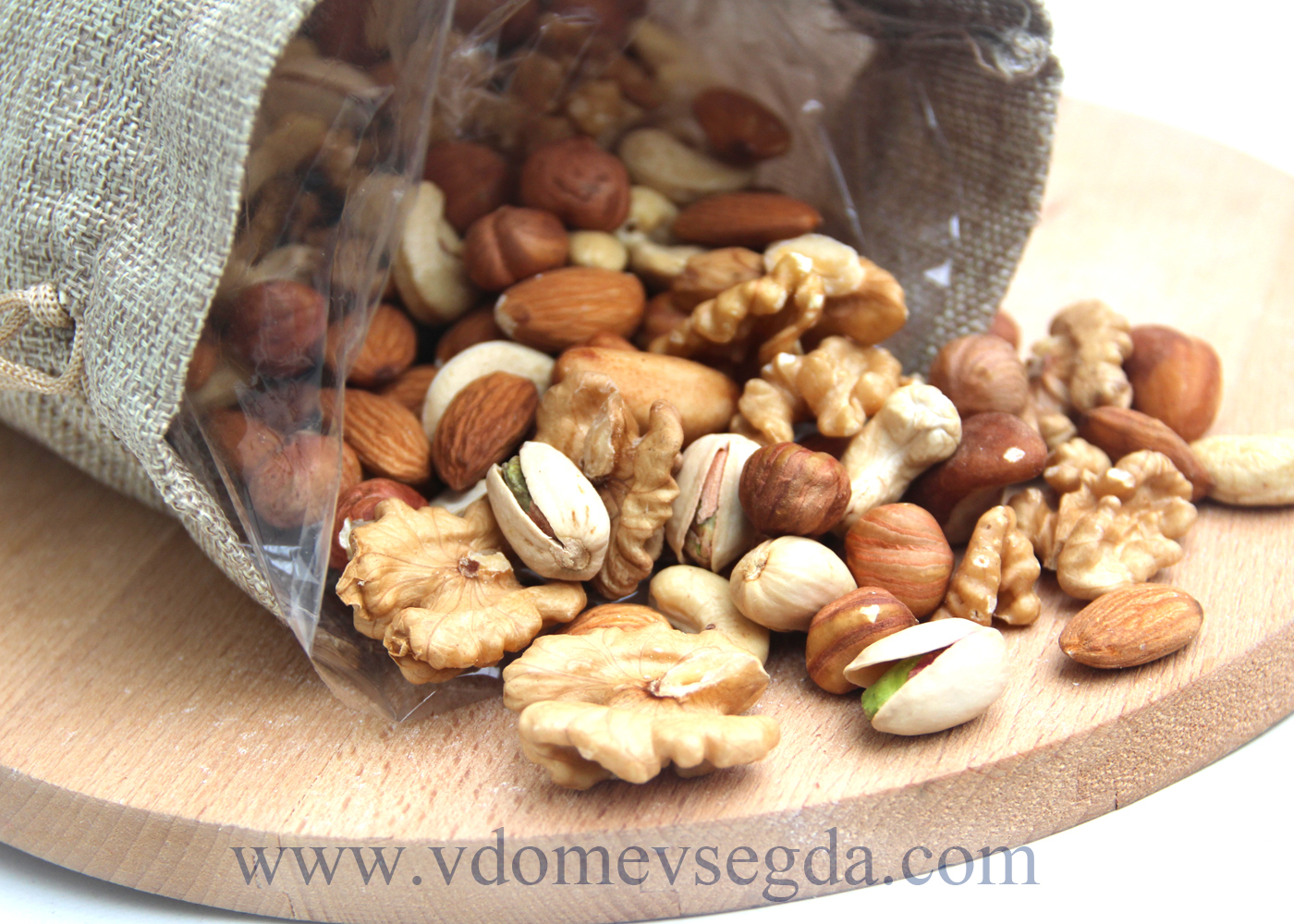 В мешочке (20см*30см) микс орешков: фундук (Азербайджан), миндаль (Калифорния), грецкие орехи (Чили), кешью(Вьетнам), бразильские(Бразилия), фисташки (Калифорния). Соотношение орешков: в равных частях. Все орешки сырые, нежареные.